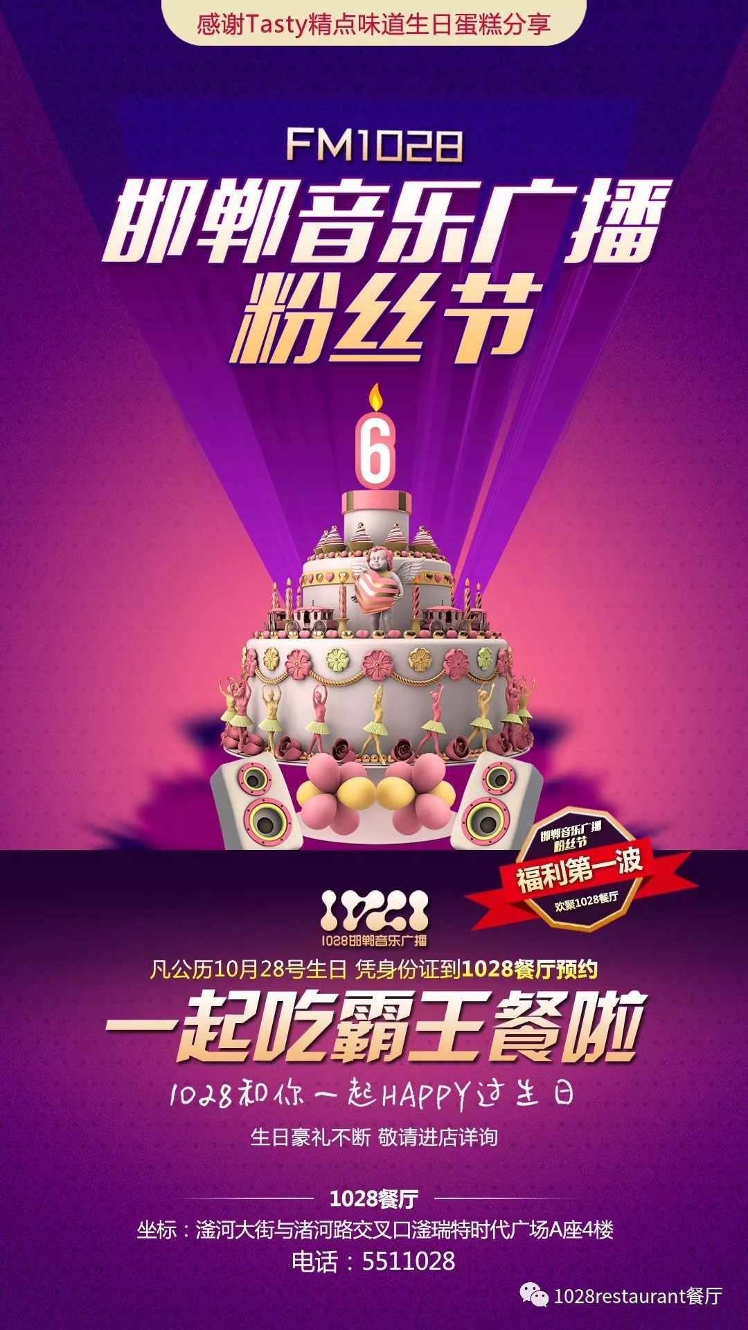 1028餐廳攜手精點味道蛋糕 請您來吃霸王餐!即日起征集前十名壽星(以身份證公歷10月28日為準(zhǔn)),可來餐廳核實并預(yù)定名額,10月28號晚,我們?yōu)槟鷾?zhǔn)備了豐盛的晚餐。并且當(dāng)晚壽星家屬來店內(nèi)就餐餐桌可享受會員價再贈送價值500元親情卡一張。